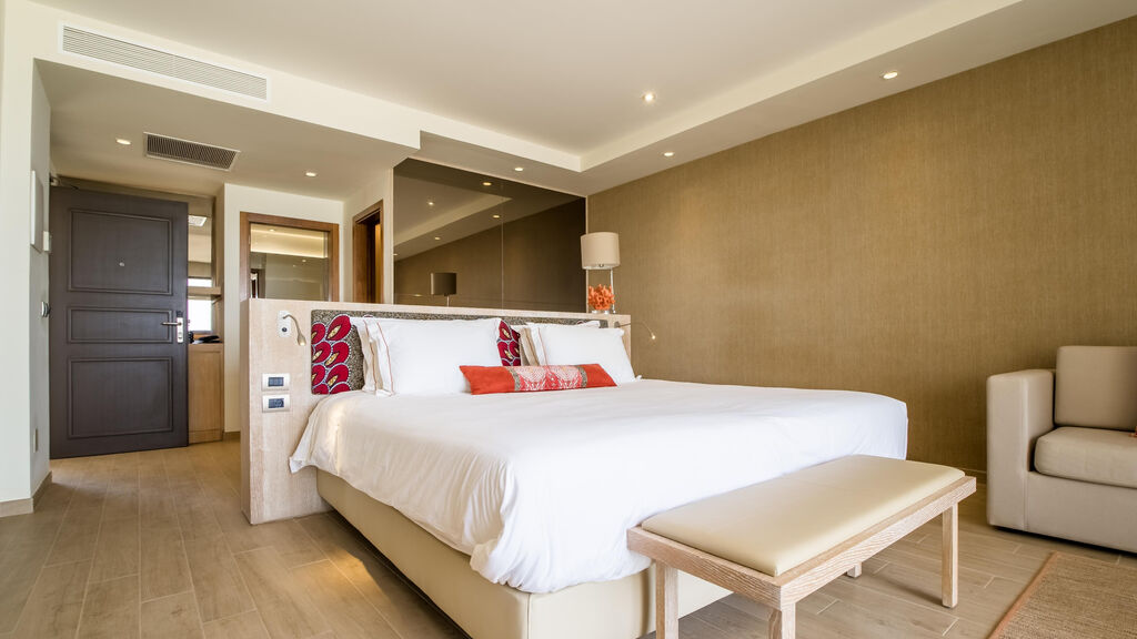 Junior suite Swim-up pokoj s výhledem na moře: Vždy čtyři přízemní pokoje mají jeden společný bazén (cca 4,5 x 19 metrů, hloubka cca 1,3 metru). Velikost pokoje cca 43 m². Stejné vybavení jako Junior suite.Dvoulůžkové pokoje umožňují ubytovat v konfiguraci 2+0, 3+0 nebo 2+1 do 12 let. V pokoji Junior Suite s výhledem do zahrady nebo na bazén je možné ubytování v konfiguraci 3+0 nebo 2+2 do 12 let.
