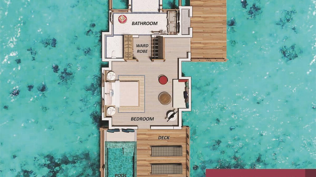 Vybavení pokojů:Water Villa: 75m2, samostaně stojící vila, vila na vodě, přímý vstup do oceánu, polootevřená koupelna, vana, sprcha, toaleta, župan, fén, klimatizace, ventilátor, minibar (zdarma), trezor, žehlící prkno, TV, Wi-Fi, terasa (zařízená), set na přípravu kávy/čaje,