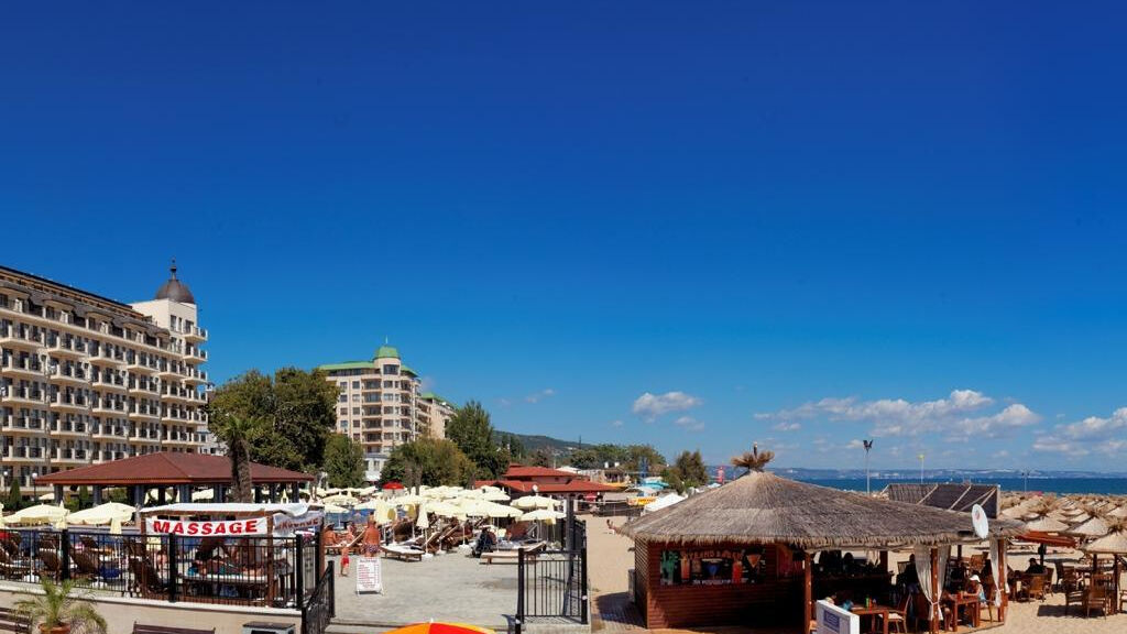 Luxusní hotel je umístěn přímo u pláže v první řadě přes promenádu v samém centru střediska Zlaté Písky.