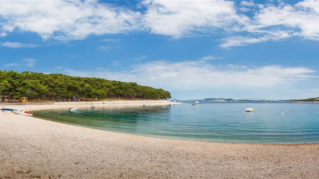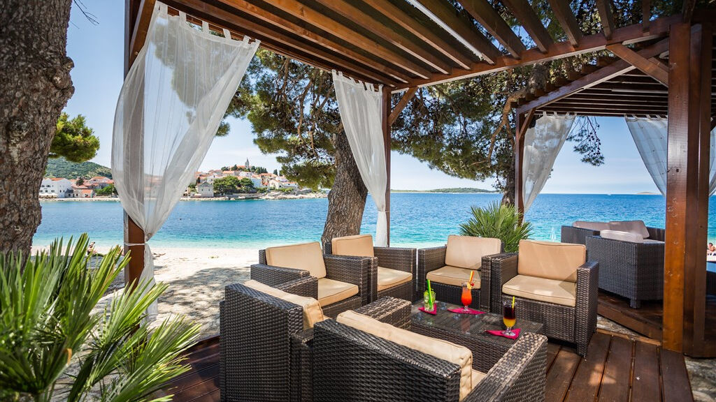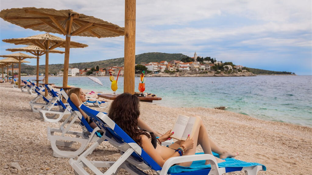 Oblázková pláž s pozvolným vstupem do moře přímo před hotelem, lehátka a slunečníky na pláži za poplatek, plážový bar. Po celé délce pláže vede promenáda, po které je možné dojít až do centra města Primošten, na které je z pláže krásný výhled.