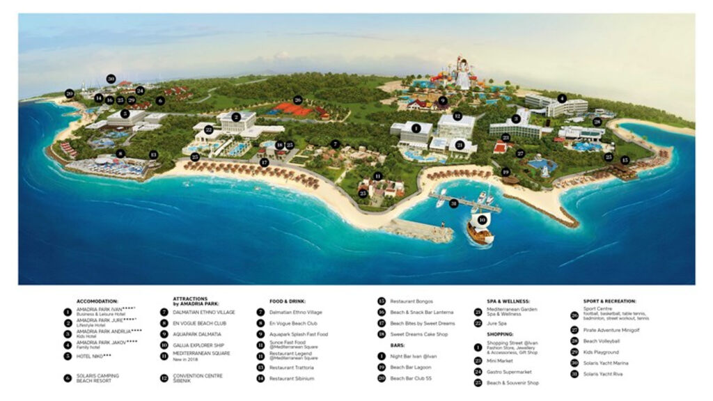 Součástí moderního resortu Amadria Park (původně Solaris), který se skládá z pěti hotelů a kempu. Resort leží na poloostrově a je vzdálen cca 6 km od centra historického města Šibenik. V bezprostřední blízkosti resortu je aquapark (Dalmatia aquapark). Letiště Split cca 60 km.