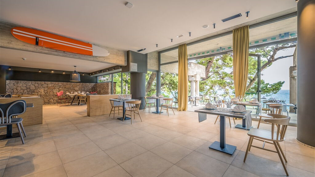 Nádherná pláž s drobnými oblázky a pozvolným vstupem do moře se nachází přímo před hotelem, přístup přes pobřežní promenádu.