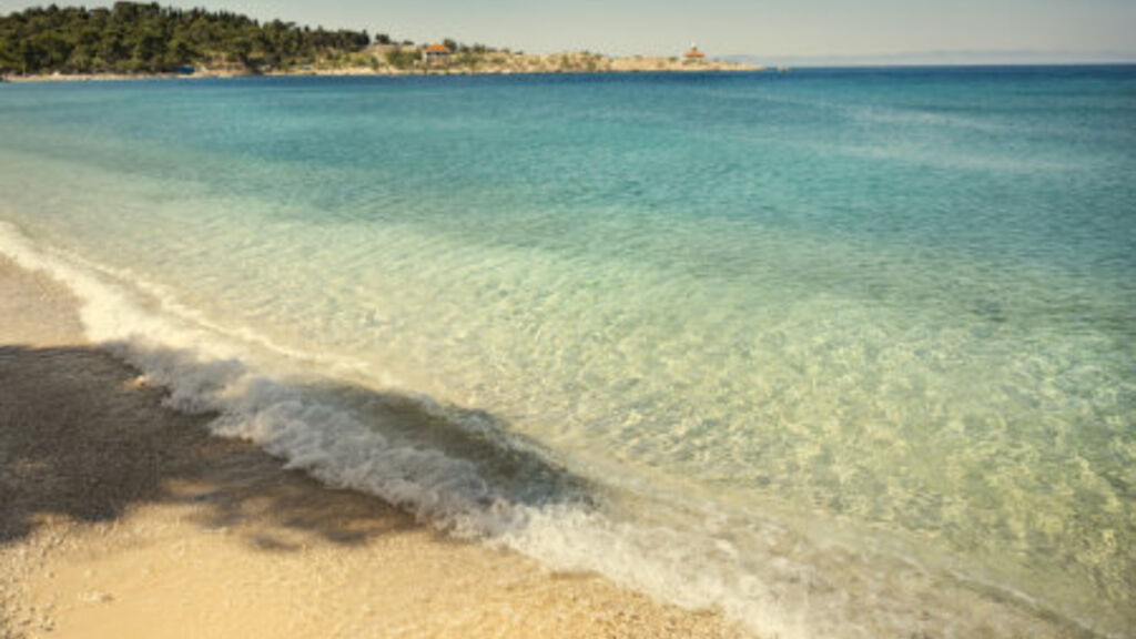 Pláž s drobnými oblázky a betonové plato na slunění se nachází před hotelem, přístup přes pobřežní promenádu.