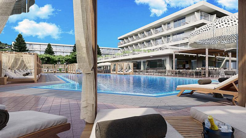 Hlavní hotelová budova (4. patra, výtah) a 2 vedlejší budovy (3. a 4. patra, bez výtahu), 179 pokojů, klimatizované společenské prostory, vstupní hala s recepcí, směnárna, hlavní restaurace (terasa s výhledem na moře), loby bar, venkovní bazén, bar u bazénu, lehátka u bazénu zdarma, parkování zdarma. Celý hotel prošel před sezonou 2020 kompletní rekonstrukcí.