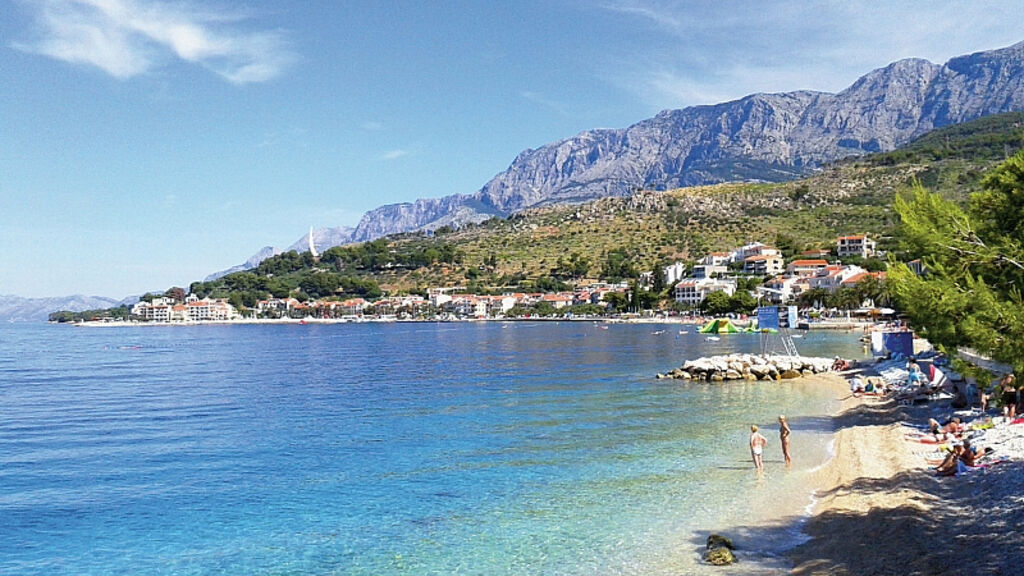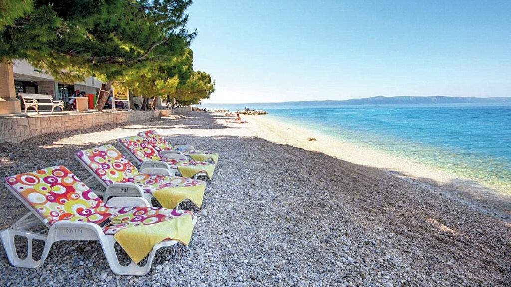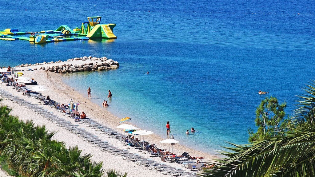 Oblázková pláž cca 30 m před hotelem, lehátka a slunečníky za poplatek.