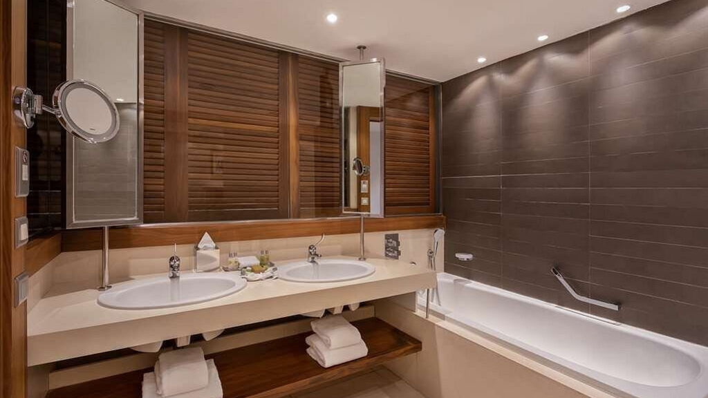 Dvoulůžkový pokoj typu Double Marina View s balkonem nebo terasou s výhledem na jachtařský přístav má vlastní příslušenství (koupelna, vana, WC, vysoušeč vlasů, župan, pantofle), TV/sat., WiFi (zdarma), klimatizaci, minibar, set pro přípravu kávy/čaje, trezor, žehličku s prknem, termostat, telefon, pracovní stůl.