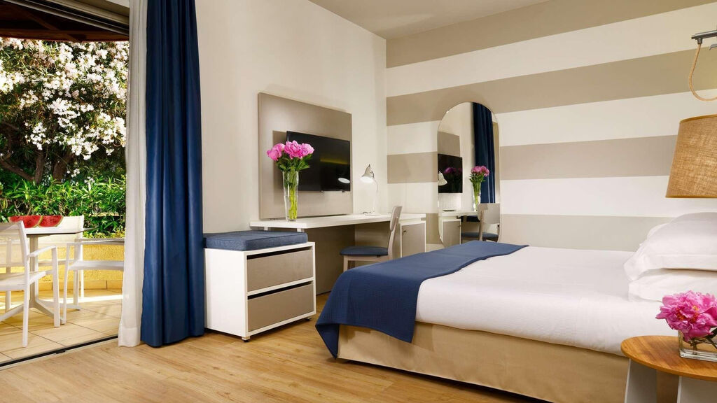 - Dvoulůžkový pokoj, Hlavní budova: koupelna/WC (vysoušeč vlasů), klimatizace, telefon, TV/sat., trezor, minibar, balkon nebo terasa, v hlavní budově.
