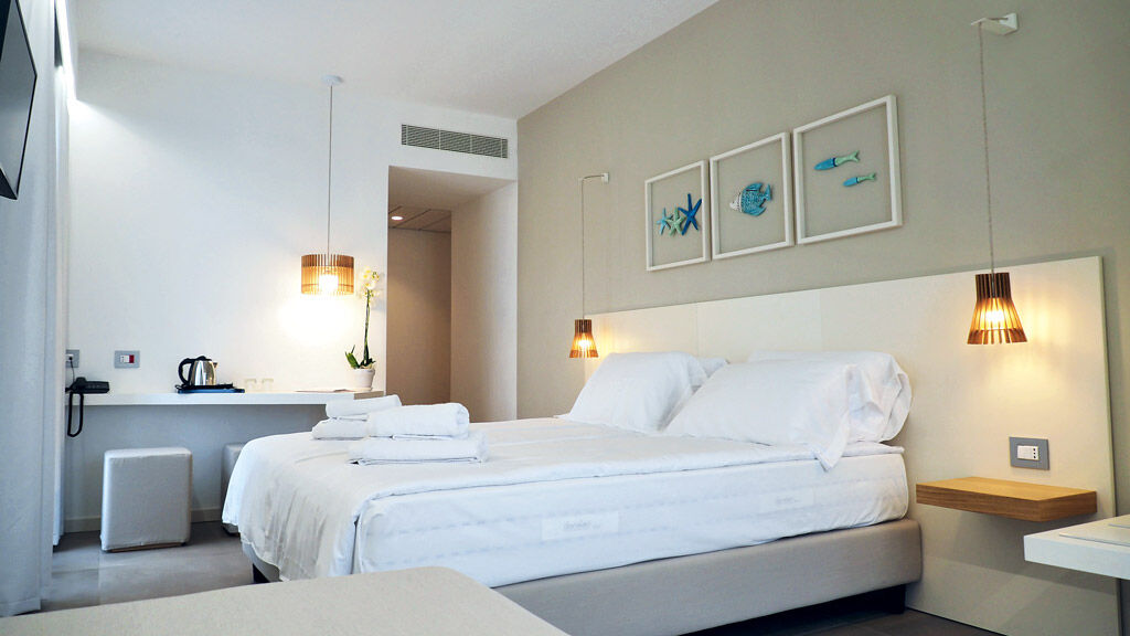 Ubytování je možné v pokojích Classic, Classic s výhledem na moře a Superior s výhledem na moře. Dvoulůžkové pokoje Classic pokoje s balkonem a sociálním zařízením (sprcha nebo vana, WC, fén) jsou klimatizovány (klimatizace zdarma) a vybaveny TV/SAT, telefonem a minibarem. Možnost jedné přistýlky. Dvoulůžkové pokoje Classic s výhledem pokoje s balkonem a bočním výhledem na moře, sociálním zařízením (sprcha nebo vana, WC, fén) jsou klimatizovány (klimatizace zdarma) a vybaveny TV/SAT, telefonem, minibarem a setem pro přípravu kávy a čaje. Dvoulůžkové pokoje Superior prostornější pokoje s balkonem a přímým výhledem na moře, sociálním zařízením (sprcha nebo vana, WC, fén) jsou klimatizovány (klimatizace zdarma) a vybaveny TV/SAT, telefonem, minibarem, setem pro přípravu kávy a čaje a malý kávovar. Možnost jedné přistýlky.