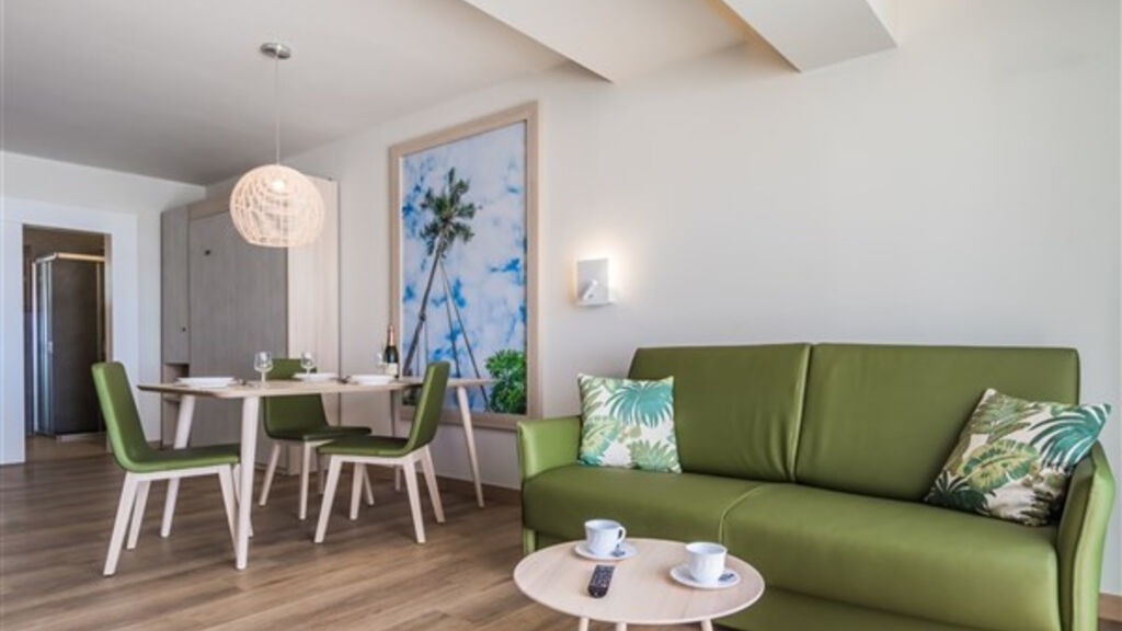 Klimatizovaný apartmán má samostatnou dvoulůžkovou ložnici oddělenou od obývací části dveřmi. V obývací části je integrovaný kuchyňský kout (lednička, mikrovlnná trouba, kávovar), televize se satelitními programy, telefon, placené Wi-Fi připojení k internetu, trezor (k pronájmu), koupelna s WC a vysoušečem vlasů. Každý má balkon nebo terasu.Maximální obsazenost (květen - říjen) - 4 dospělé osoby nebo 2 dospělé osoby, 1 dítě a 1 dítě do 2 let.
