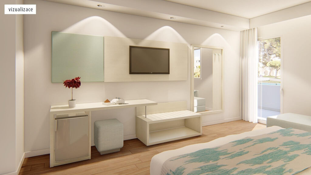 DR: koupelna/WC, vysoušeč vlasů za poplatek (na vyžádání), klimatizace, telefon, TV/sat., trezor za poplatek, balkon nebo terasa. DRS: viz DR, prostornější.