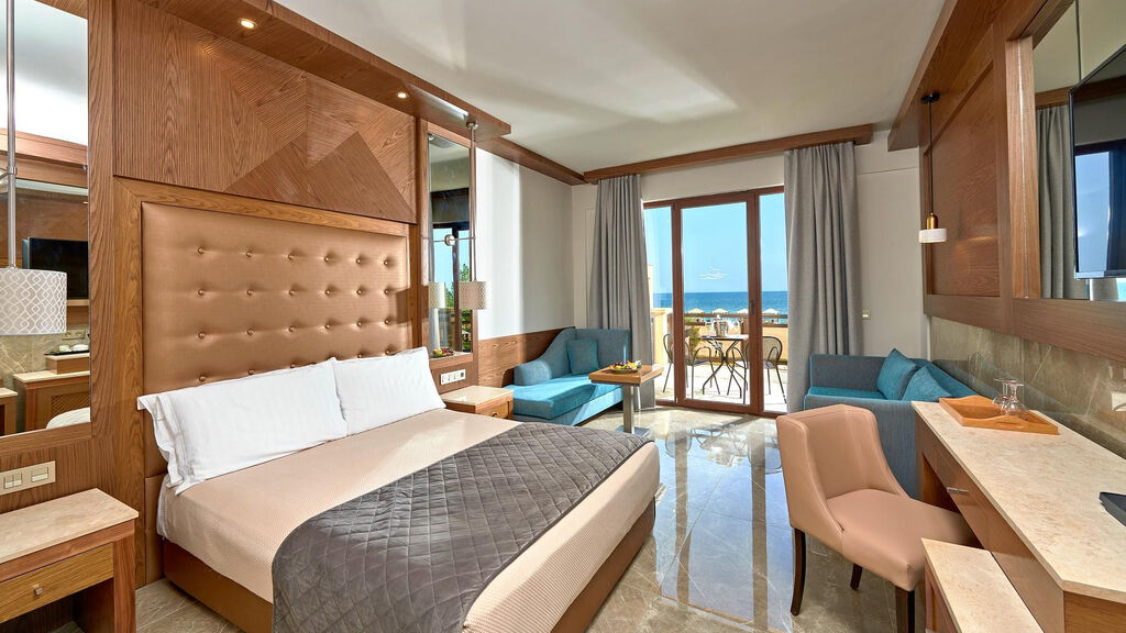 - Suita: luxusní 2 oddělené místnosti (ložnice a oddělený ovývací pokoj, celkem 46-52m2), výhled na bazén a částečně na moře, na vyžádaní.