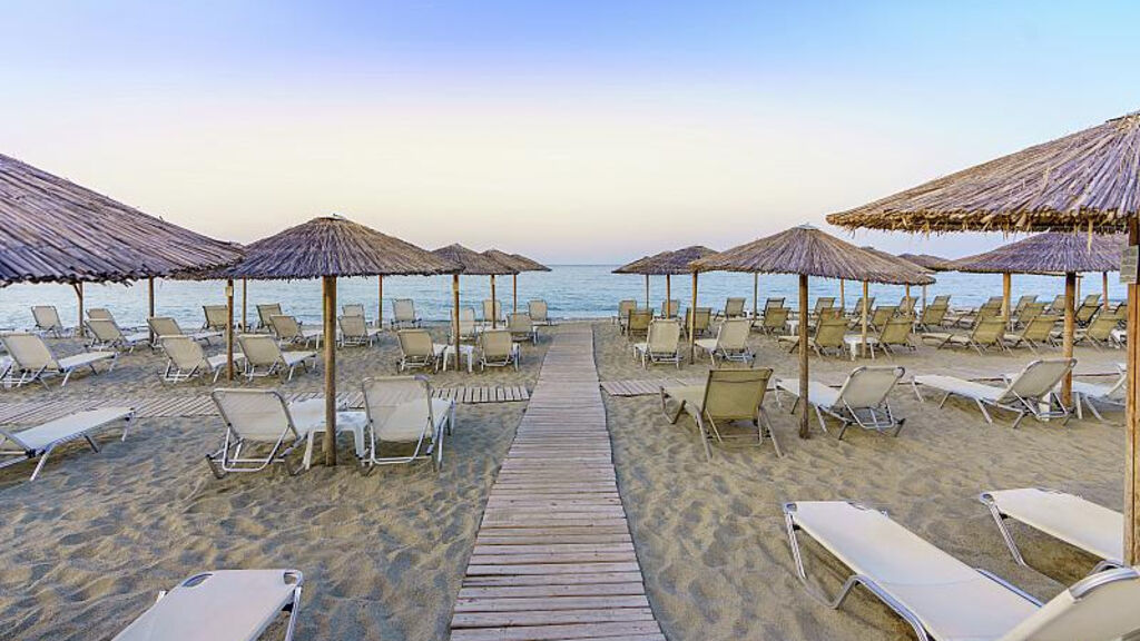 Přímo u privátní písečné pláže oceněné modrou vlajkou, lehátka a slunečníky zdarma, osušky oproti kauci, plážový bar.