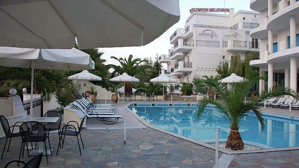 Hotel Olympion Melathron umístěný na okraji letoviska Platamonas a Nei Pori, pod zeleným Olympem, pouhých 100 metrů od písečné pláže, nabízí klidnou dovolenou v dosahu prázdninových letovisek.