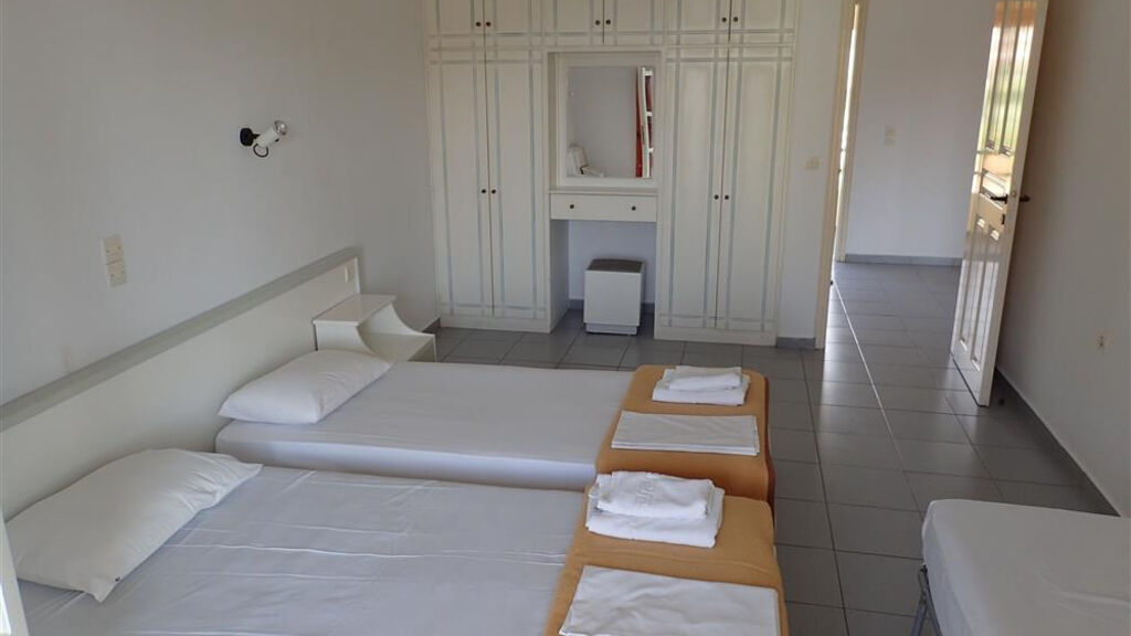dvoulůžková studia s možností přistýlky, apartmány až pro 5 osob (2 místnosti), koupelna s toaletou, klimatizace za poplatek cca 7 €/den (studia), klimatizace za poplatek cca 12 €/den (apartmány), kuchyňský kout (lednice, vařič, varná konvice, mikrovlnná trouba, základní nádobí), Wi-Fi, balkon nebo terasa,