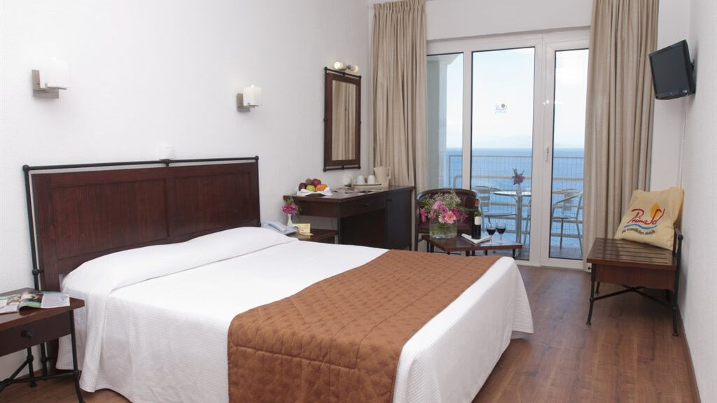 Vybavení pokojů:Dvoulůžkový pokoj, Výhled moře: koupelna/WC (vysoušeč vlasů), klimatizace (pouze v období 1. 6. – 30. 9.), telefon, TV/sat., trezor za poplatek, minilednička, set na přípravu kávy a čaje, balkon nebo terasa.