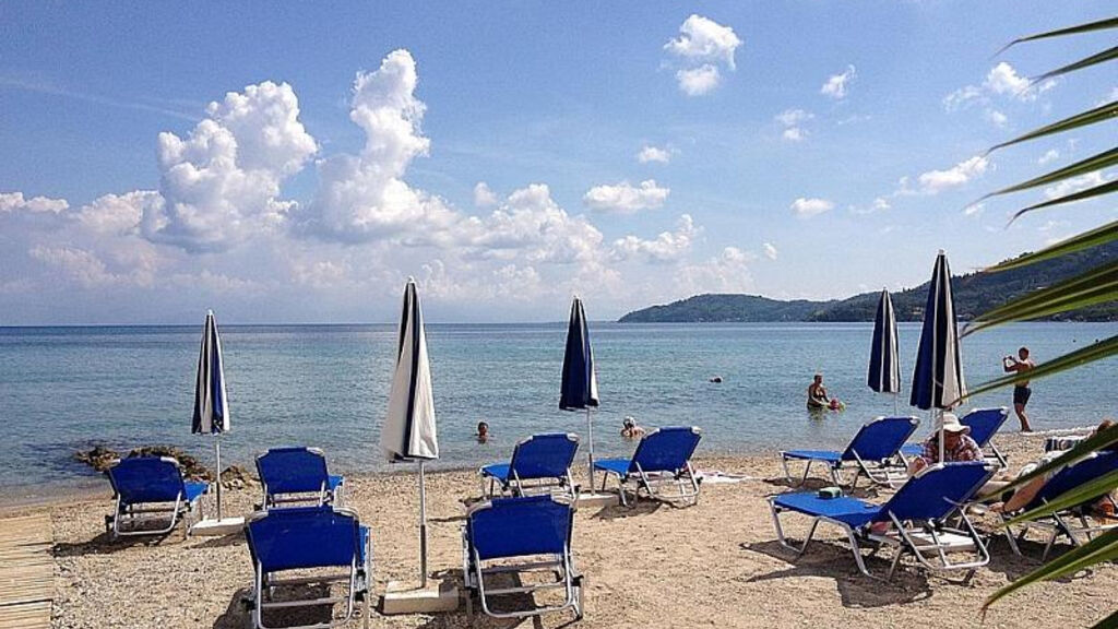 Písečnooblázková pláž Messonghi s pozvolným vstupem do moře cca 100 m, lehátka a slunečníky za poplatek.