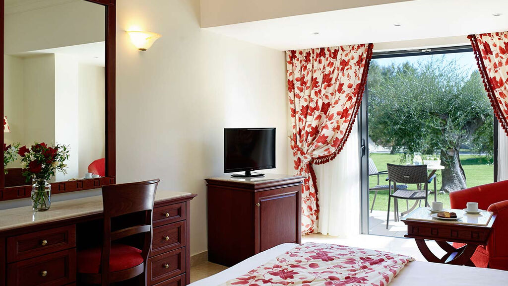 Vybavení pokojů:Dvoulůžkový pokoj, Výhled zahrada: koupelna/WC (vysoušeč vlasů, pantofle a župany), TV/sat., klimatizace, set na přípravu kávy a čaje, telefon, minilednička (denně doplňována vodou), trezor, balkon nebo terasa, 22-25m2. Lehké přikrývky plněné peřím. Přistýlka pro děti může být i formou palandy.