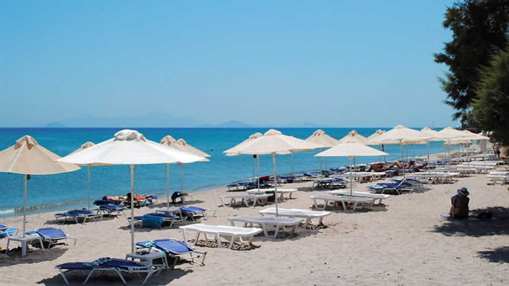 Písčitá pláž místy s oblázky a pozvolným vstupem do vody patří k nejdelším na ostrově. Nachází se cca 150 m od hotelu, slunečníky a lehátka za poplatek (cca 5 EUR/set).