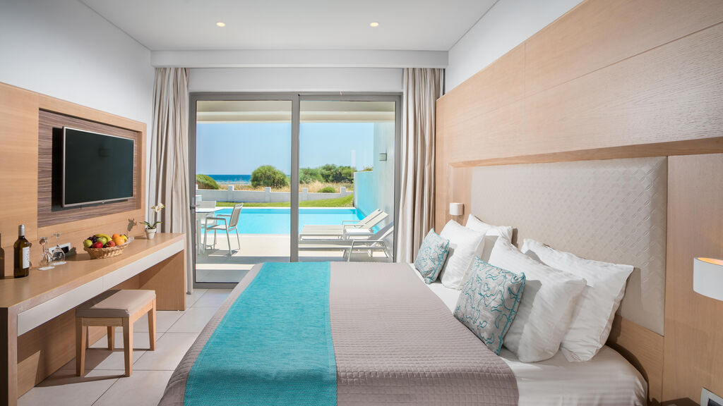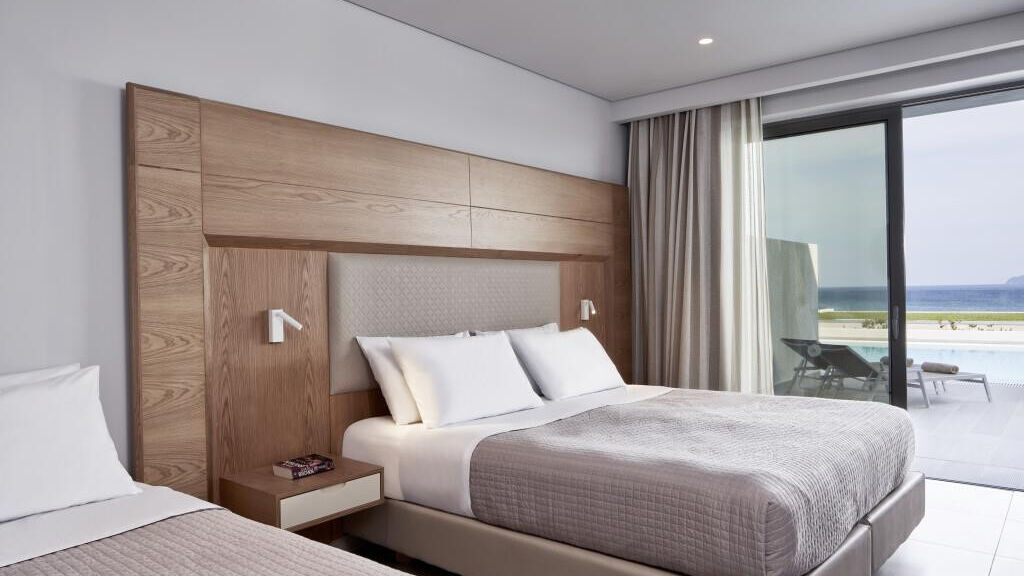 - Junior suite, Výhled směrem k moři: 2 oddělené ložnice, 4 pevná lůžka, výhled směrem k moři, 48m2.