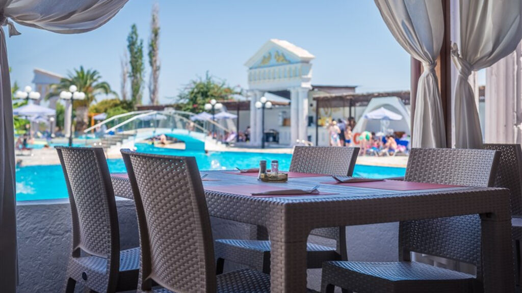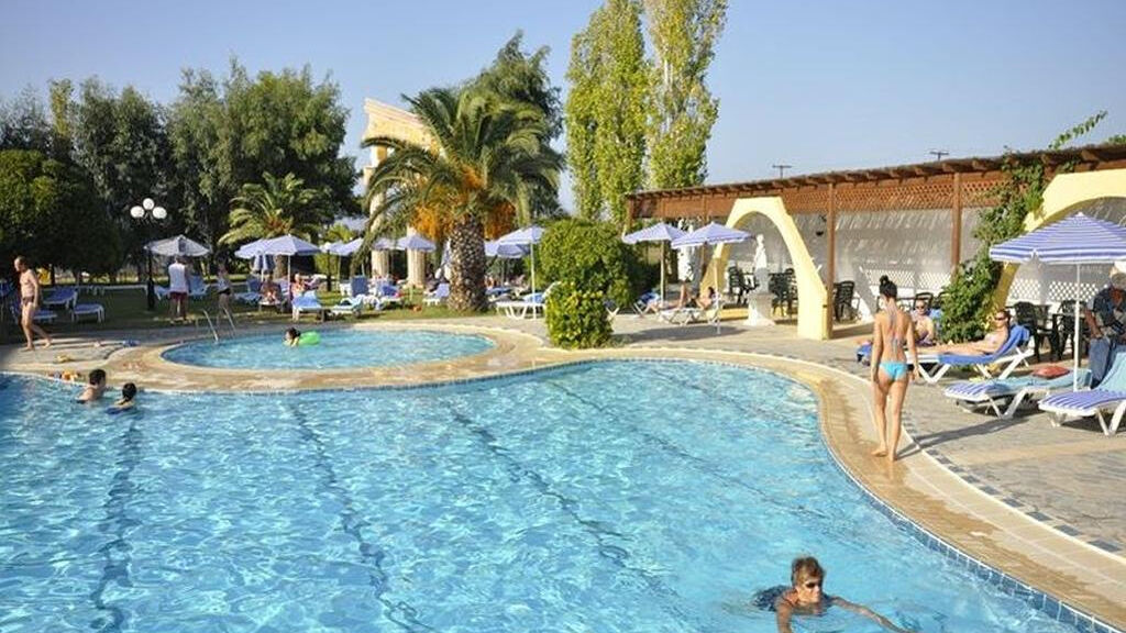 Hlavní budova a několik samostaných bloků ve stylu antické architektury, vstupní hala s recepcí, lobby bar, hlavní restaurace, TV místnost, minimarket, obchod se suvenýry. Venku bazén, nový dětský bazén se skluzavkami, terasa na slunění, lehátka, slunečníky a osušky zdarma, bar u bazénu, dětské hřiště.