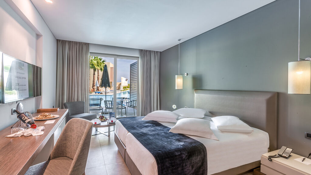Vybavení hotelu:Hlavní budova a přilehlé dvoupatrové budovy, vstupní hala s recepcí, hlavní restaurace, taverna, a la carte restaurace, bary, konferenční sály, minimarket. V rozlehlé zahradě 2 bazény s jacuzzi, dětský bazén, terasa na slunění, lehátka, slunečníky a osušky zdarma, bar u bazénu.