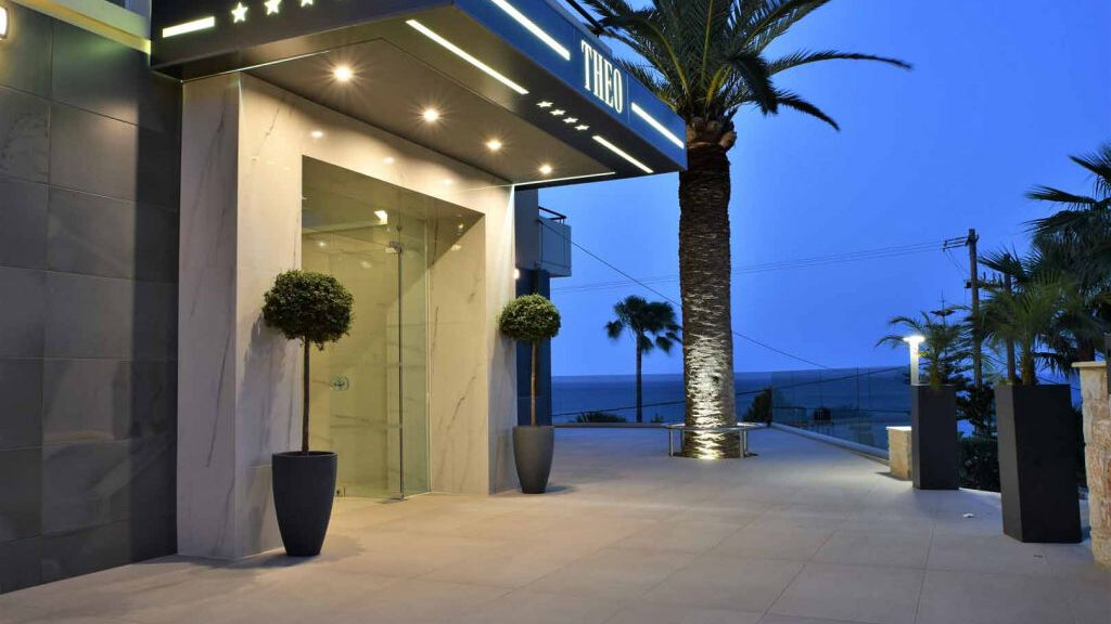 Hotel Theo tvoří komplex samostatných budov s hlavní budovou. Je postaven na krásném místě ve svahu, odkud je fantastický výhled na moře. Od krásné dlouhé písečné pláže s pozvolným vstupem do moře je zdálen cca 200 m. Díky svému vybavení a své poloze, je hotel oblíbenou ubytovací kapacitou pro všechny věkové kategorie. Hotel nabízí spoustu vyžití v okolí, neboť se nachází v centru oblíbeného letoviska Agia Marina. Dále v letovisku naleznete supermarkety, mini trhy, banky, zábavní centra pro děti atd. Od Chanie je vzdálen 7 km a 18 km od letiště.