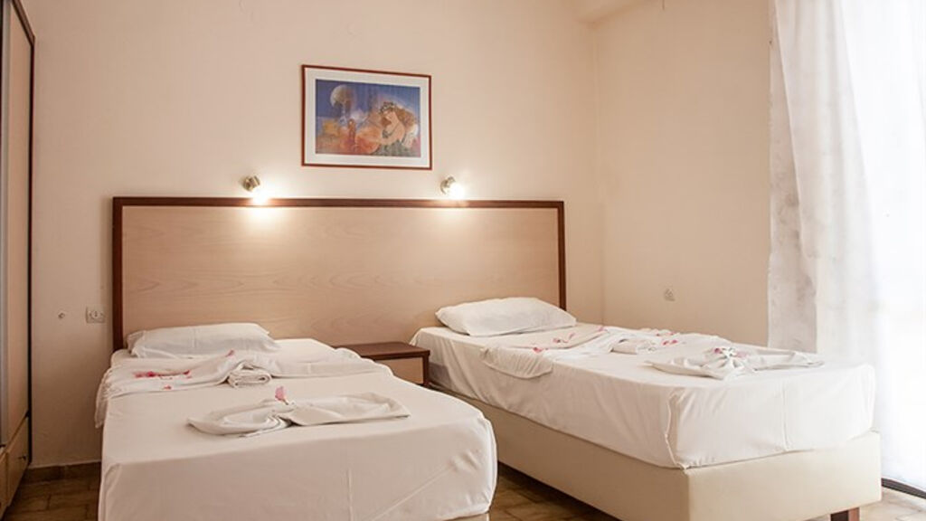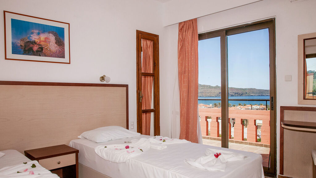dvoulůžková studia s výhledem na moře, dvoulůžkové apartmány s možností dvou přistýlek s výhledem na moře (2 místnosti), koupelna s toaletou, fén , SAT/TV, Wi-Fi, telefon, lednice, kuchyňský kout (lednice, vařič, základní nádobí), klimatizace (za poplatek cca 8 €/studio/den a cca 15 €/apartmán/den) , trezor (za poplatek cca 15 €/týden), balkon nebo terasa,