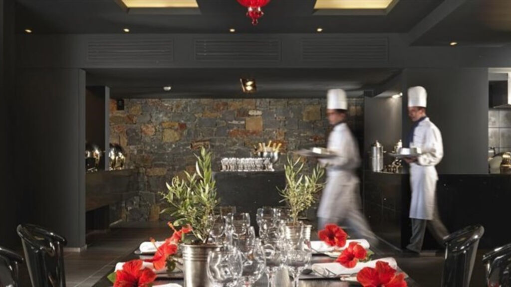 bary a restauracenabízející pět rozdílných typů kuchyní - mezinárodní, italskou, středozemní, tradiční řeckou či krétskou, nákupní arkáda a minimarket s nabídkou řeckých produktů, butik, botanická zahrada s malou zoo