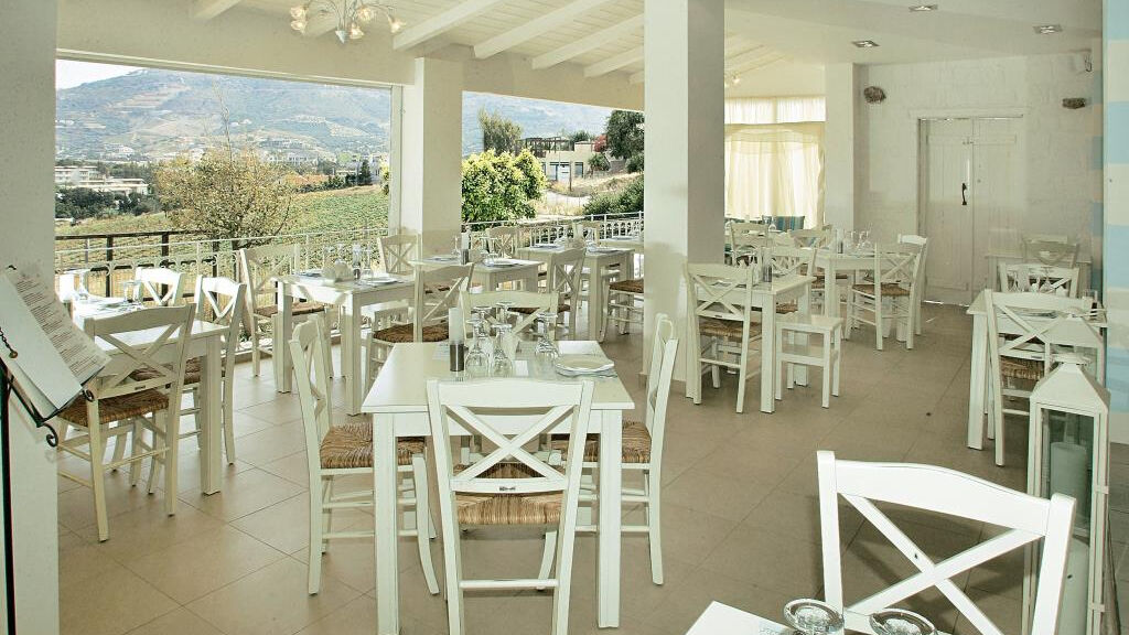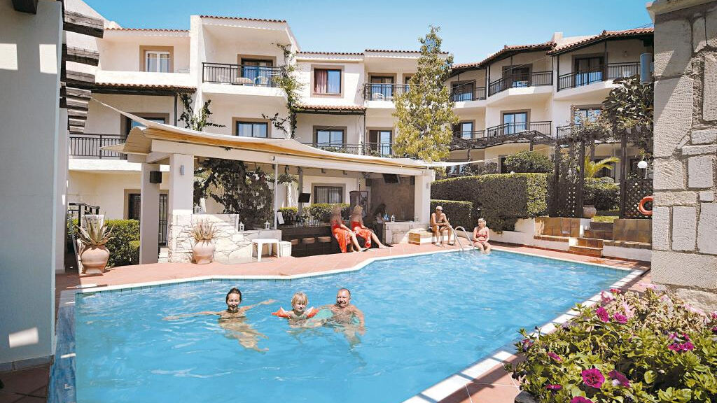 nově renovovaný aparthotel. 40 pokojů v hlavní a vedlejší budově, recepce s trezory k pronajmutí (cca 10€/týden), restaurace "Yamas", taverna/bar s panoramatickým výhledem. Ve venkovním areálu malý bazén s mořskou vodou, opalovací terasa, bar u bazénu. Lehátka a slunečníky u bazénu zdarma. Osušky na kauci.