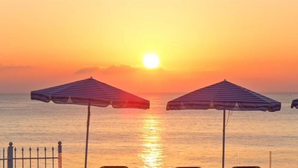 Písečná pláž s oblázky přímo pod hotelem (přístup po schodech), doporučujeme obuv do vody. Další písečná pláž s oblázky cca 400 m od hotelu. Betonová plata, skalnatý vstup do moře přímo pod hotelem (vhodné pro potápění), bar. Lehátka a slunečníky na všech plážích za poplatek.
