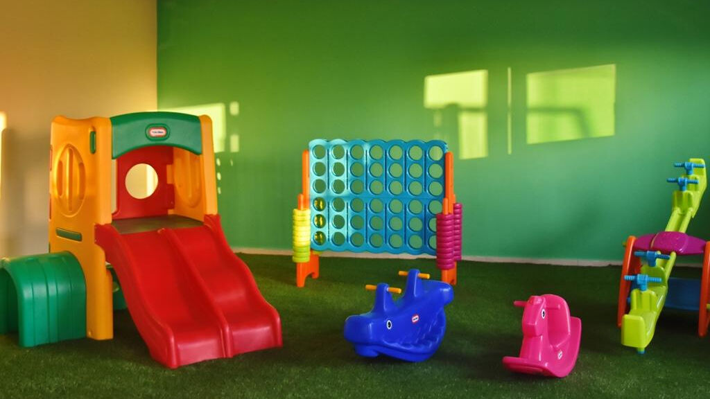 Dětský bazén, hřiště, dětská postýlka, dětské stoličky v restauraci