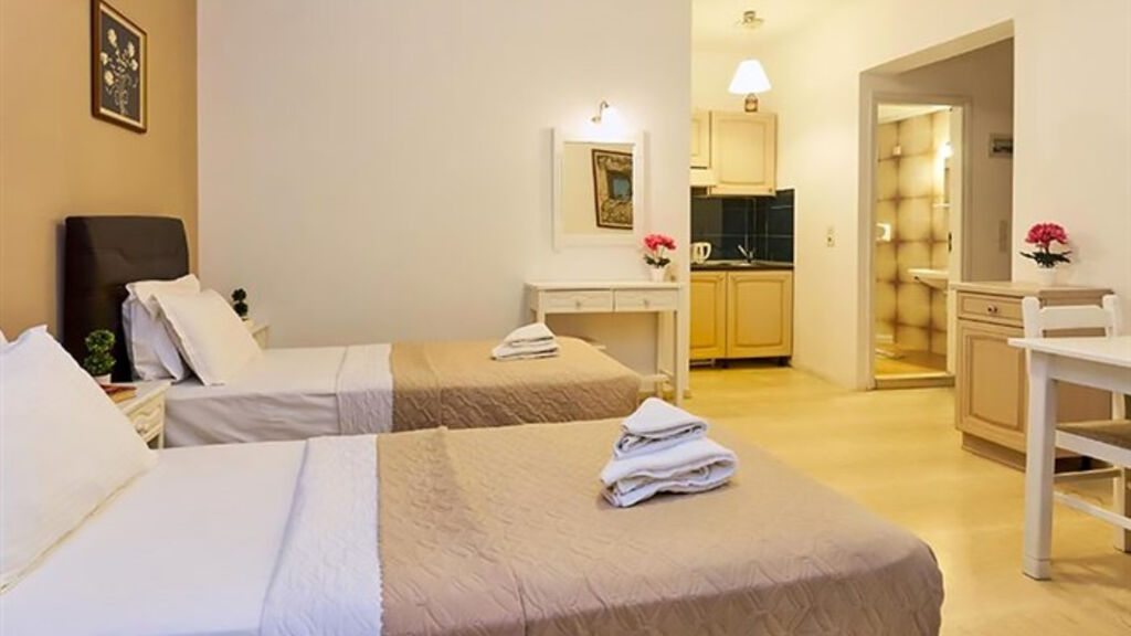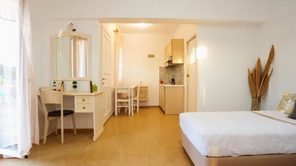 dvoulůžková studia , apartmány až pro 3 osoby (2 místnosti), koupelna s toaletou, fén, kuchyňský kout (lednice, vařič, konvice, základní nádobí), klimatizace (za poplatek 10 €/ den), Wi-Fi, balkon nebo terasa, dětská postýlka na vyžádání zdarma,