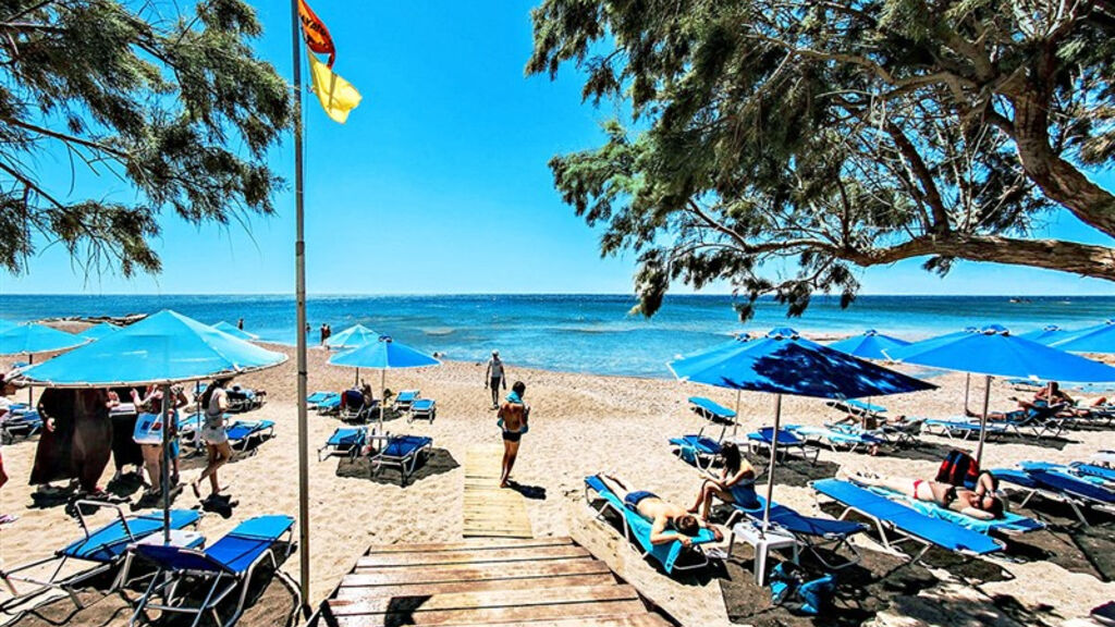 Veřejná, písčito-oblázková, pozvolný vstup do moře, přímo u hotelu, bezplatné slunečníky, lehátka i osušky.