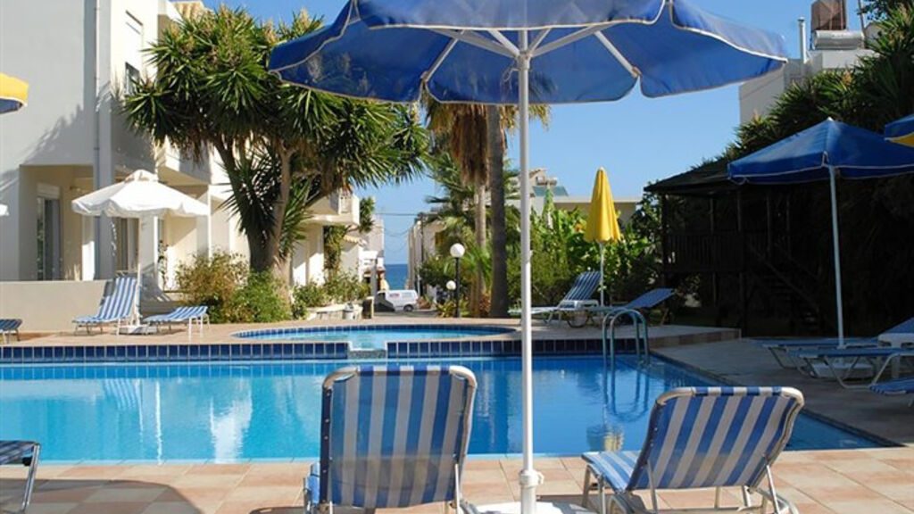 Aparthotel je situován v rušném letovisku Stalos, které se nachází v severozápadní části ostrova Kréta. Letovisko leží 22 km od letiště a 7 km od přístavního města Chania. Prostorná studia a apartmány jsou vybaveny koupelnou, kuchyňským koutem s jídelním stolem, klimatizací, trezorem a setem na přípravu kávy a čaje. V areálu je pro hosty k dispozici bazén s mělkou částí vhodnou pro děti, dětské hřiště, restaurace a bar. V blízkosti hotelu se nachází nákupní možnosti, restaurace a taverny. Dlouhá písečná pláž s jemným pískem a pozvolným vstupem do moře je vzdálena pouhých 100 m přes místní komunikaci. Na své si přijdou i milovníci vodních aktivit, kteří mohou na pláži využít např. školu surfování. Doporučujeme párům i rodinám s dětmi.