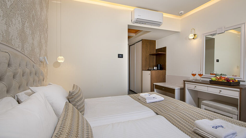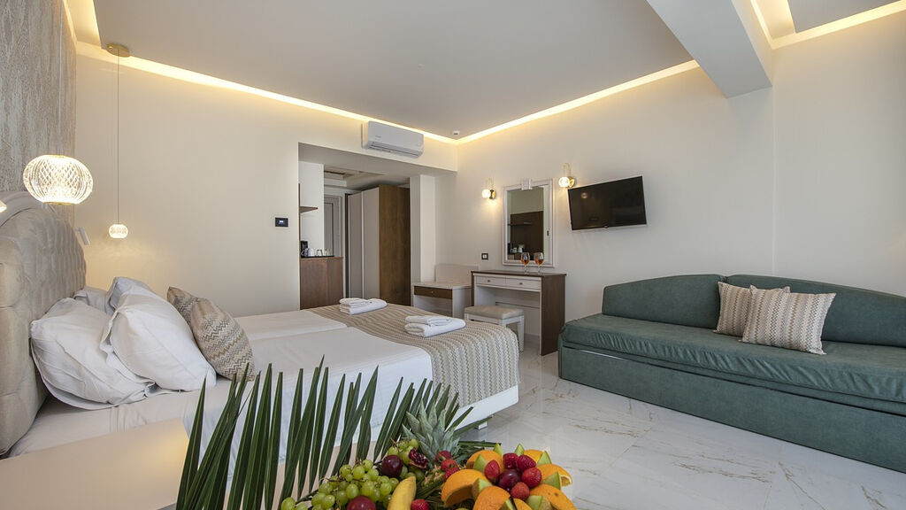 Za poplatek: vodní sporty na pláži, fitness a jacuzzi v sousedním hotelu Vantaris Palace, masáže.