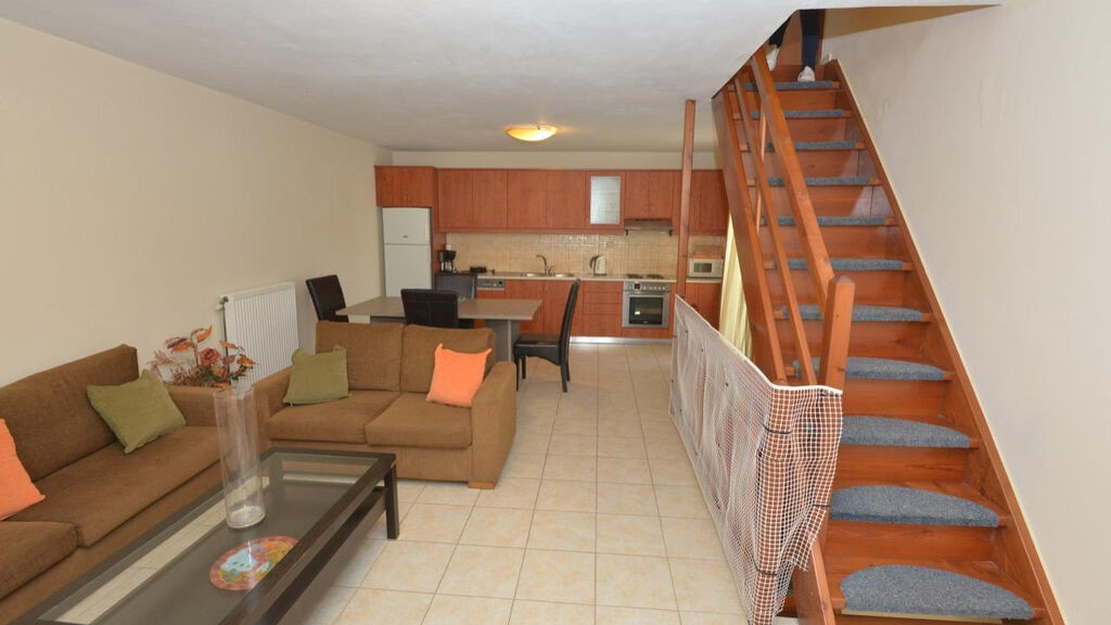 Nadstandardně zařízené mezonetové apartmány až pro 6 osob. K vybavení patří obývací část s kuchyní (lednice, sporák, myčka, trouba, mikrovlnka, kávovar, varná konvice, toustovač), 3 ložnice, TV/SAT, klimatizace, 3 koupelny, terasa.