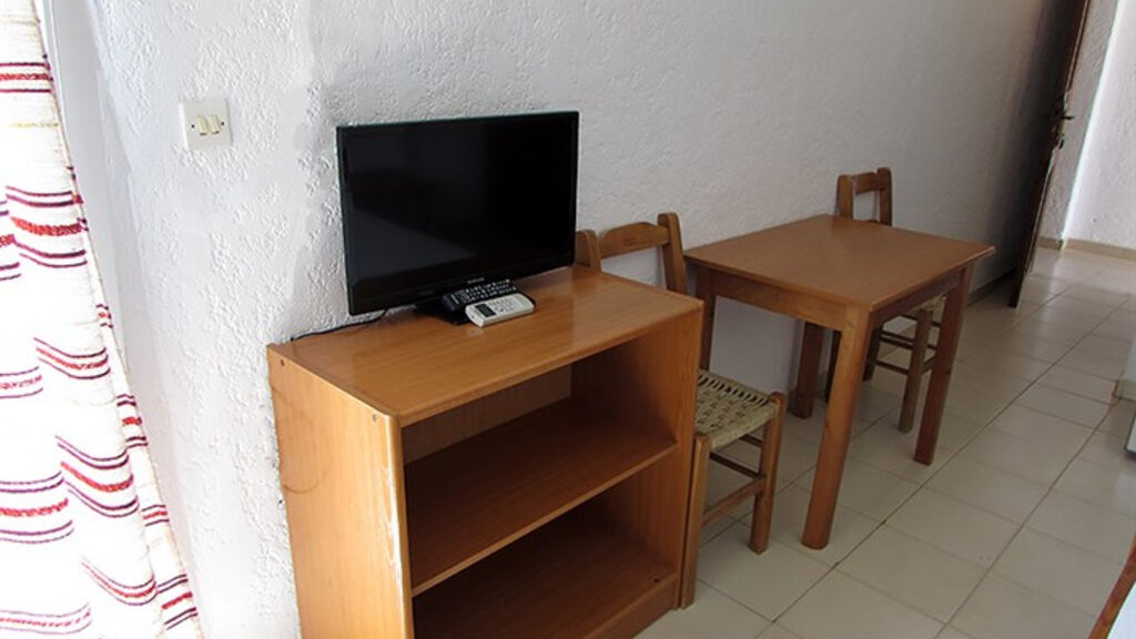 Dvoulůžková studia s možností až 2 přistýlek (max. obsazenost 4 dospělé osoby, 1 místnost), klimatizace (5 €/ den), lednice, TV/SAT, Wi‑Fi (po celém areálu zdarma), kuchyňský kout, koupelna, balkon nebo terasa.