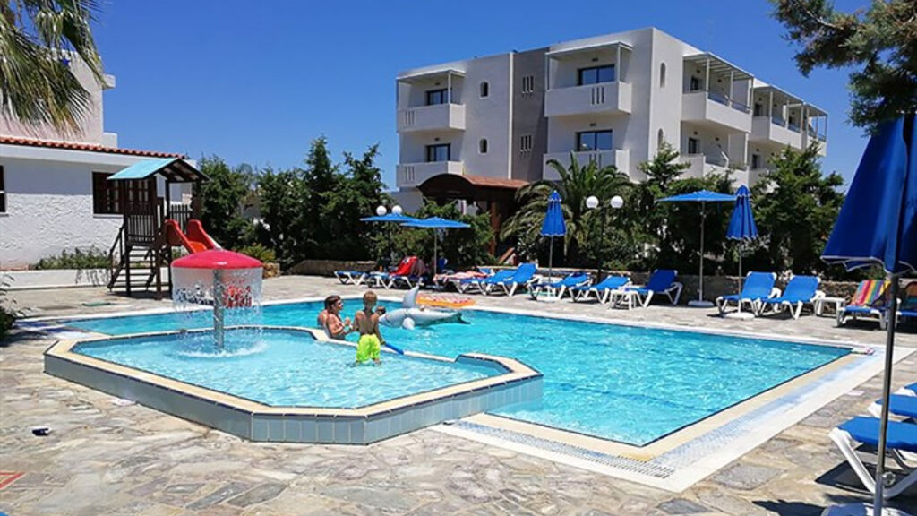 Aparthotel se nachází 260 m od písečné pláže ve známém a živém letovisku Malia. Ubytování je postaveno v zahradě a nabízí plně vybavená studia s kuchyňským koutem, klimatizací a Wi-Fi připojením. V okolí je spousta taveren, supermarketů a ve vzdálenosti 200 m je k dispozici autobusová zastávka, která může sloužit také k návštěvě dalších letovisek a krásných míst na ostrově Kréta. Doporučujeme klientům všech věkových kategorií.