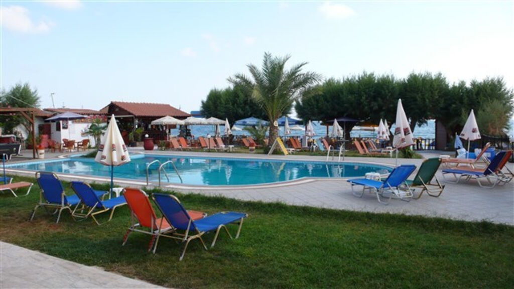 venkovní bazén, malý oddělený dětský bazén lehátka a slunečníky u bazénu bez poplatku, přímo u písečné pláže