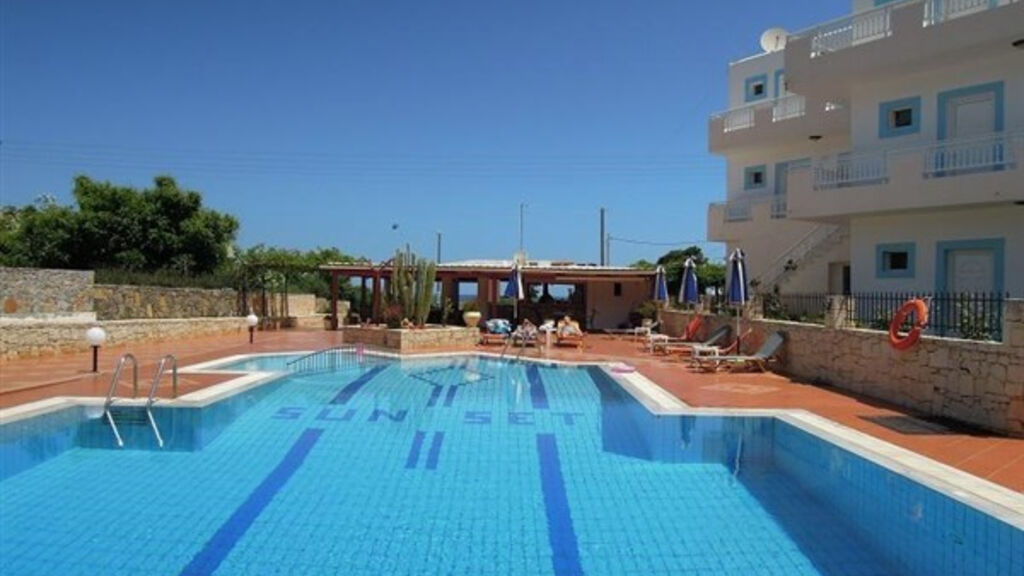 Apartmánový dům Sunset se nachází v oblíbeném prázdninovém letovisku Malia (Řecko, Kréta) jen 190 m od krásné široké písečné pláže s pozvolným vstupem do moře. Uzavřený komplex nabízí klid a soukromí, přesto hosté, kteří zatouží po zábavě, nákupech v místních obchůdcích a posezení v tavernách a barech, naleznou živé centrum jen 50 m od ubytování. Dům nabízí recepci, bar u bazénu s nabídkou nápojů a s možností zahrát si za poplatek kulečník, satelitní TV, Wi‑Fi připojení zdarma (ve společných prostorách), venkovní bazén s oddělenou dětskou částí a lehátky a slunečníky zdarma. Poloha studií je ideální i v případě, že jste se rozhodli zapůjčit si motorku nebo auto v místní půjčovně a hodláte navštívit blízké vesničky Mochos, Krasi, minojský palác v Malii, klášter Kera anebo se chcete vydat do vzdálenějších míst tohoto krásného ostrova. Příjemná atmosféra ubytování v blízkosti centra i pláže s nabídkou vodních sportů je zárukou skvělé dovolené. Užijte si řecké pohostinnosti a atmosféry rodinných taveren.