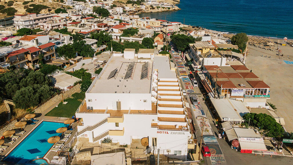 Hotel Zafiria se nachází přímo v centru proslulé Mataly na jižním pobřeží Kréty nedaleko minojského paláce Festos, 70 kilometrů od letiště v Heraklionu. Pláž je vzdálena pouhých 50 metrů. Pobřežní promenáda je lemovaná obchody, tavernami a kavárnami.