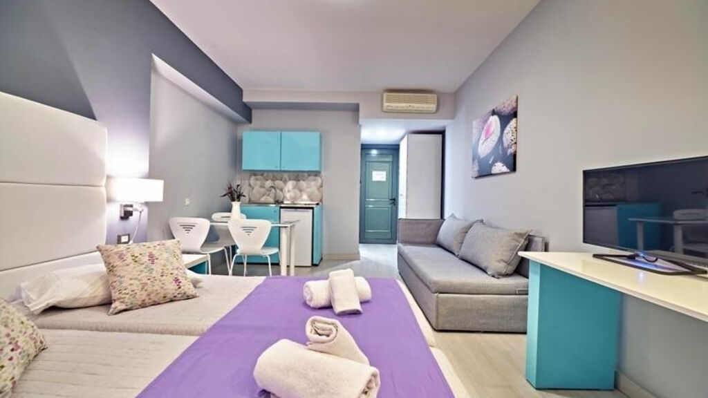 Vybavení pokojů:Studio: koupelna/WC (vysoušeč vlasů), balkon nebo terasa, individuálně ovládaná klimatizace, televize, trezor (za poplatek), lednička, wi-fi (zdarma), sofa, kuchyňka, dětská postýlka na vyžádání