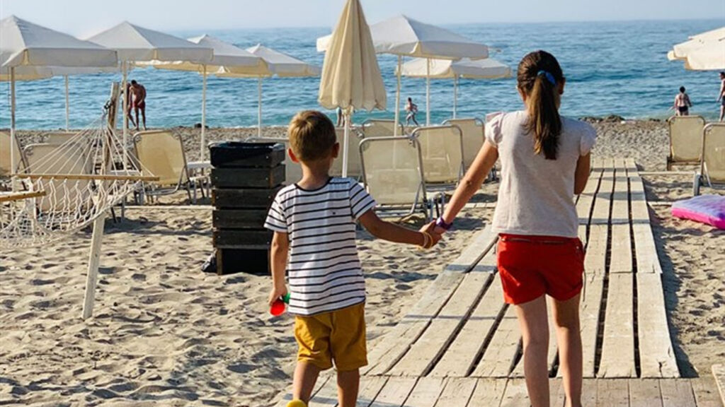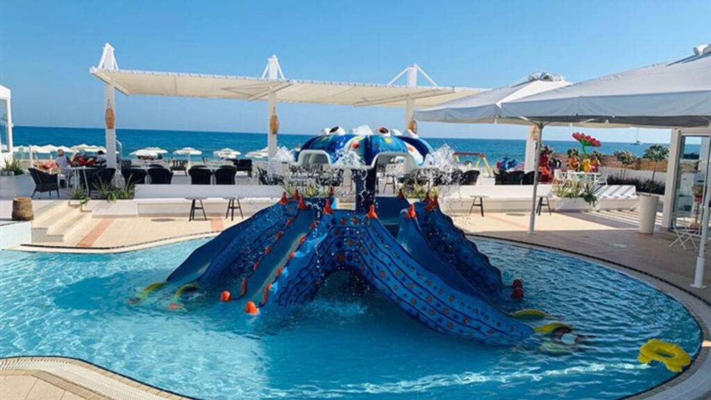 Písčito-oblázková pláž s pozvolným vstupem do moře se nachází přímo u hotelu. Lehátka a slunečníky za poplatek (cca 7 EUR/set). Plážové osušky za poplatek a vratný depozit.