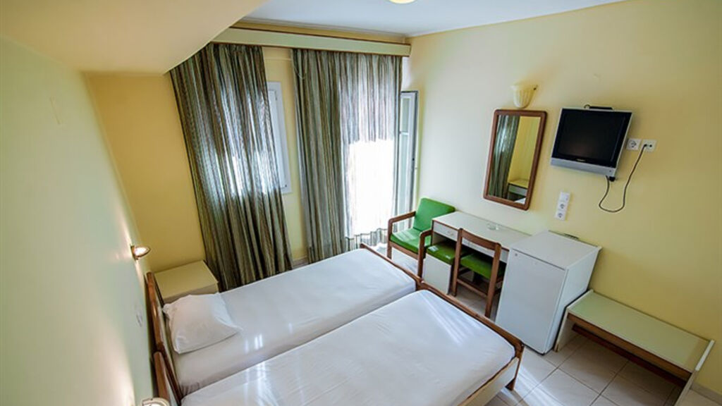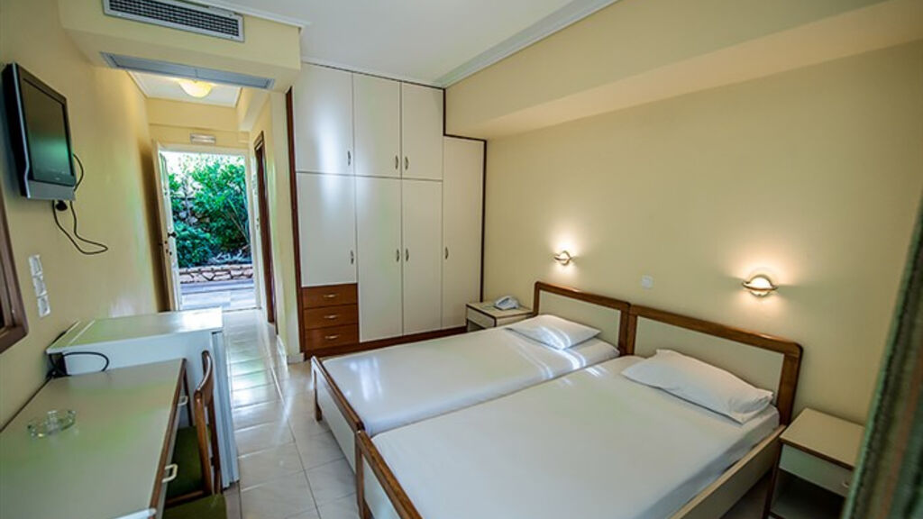 Ubytování je k dispozici ve dvoulůžkových nebo třílůžkových pokojích. Za příplatek je možno objednat i jednolůžkový pokoj. Každý pokoj disponuje vlastním sociálním příslušenstvím (vč. vysoušeče vlasů), malou lednicí, telefonem, televizí, klimatizací, trezorem a balkonem či terasou s venkovním posezením. V hotelu je též k dispozici Wi-Fi připojení (vč. pokojů). Většina pokojů je s výhledem na moře - na vyžádání, nelze garantovat. Pokoje v přízemí mají výhled do zahrady.