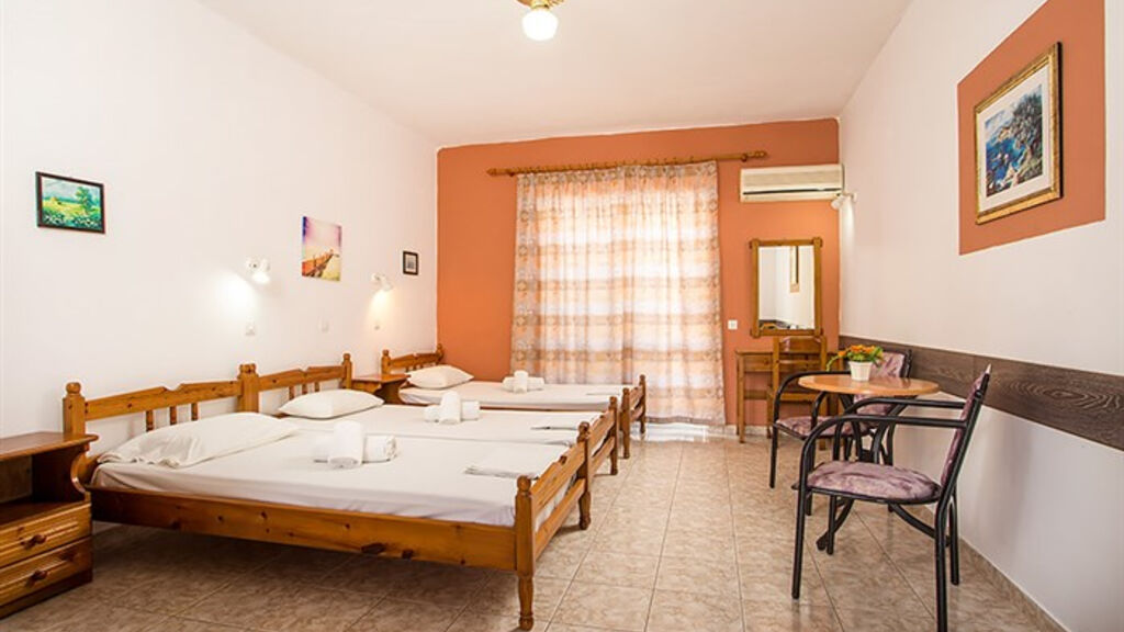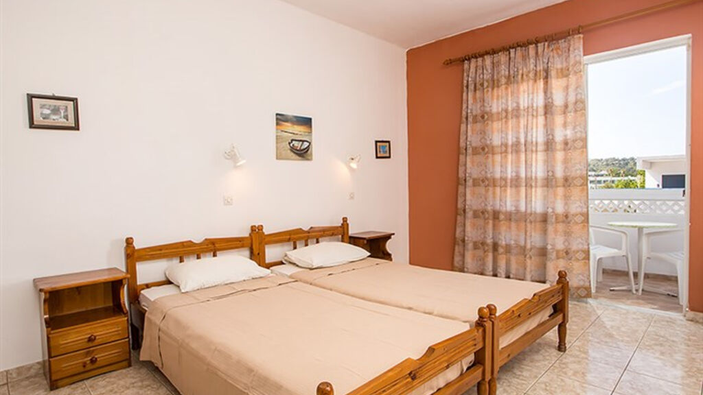 dvoulůžková studia s možností přistýlky, koupelna s toaletou, kuchyňský kout (lednice, vařič, základní nádobí), klimatizace (za poplatek cca 9 €/den), balkon nebo terasa, dětská postýlka na vyžádání zdarma,