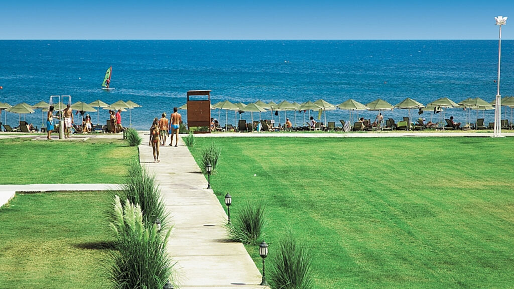 Dlouhá a široká písečnooblázková pláž 30 metrů od relaxačního bazénu. Lehátka a slunečníky zdarma, osušky oproti kauci.