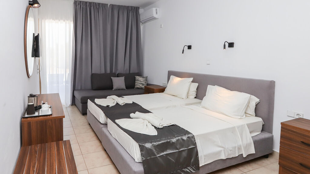 Pláž:Oblázková pláž v Kolymbii (Nissaki) cca 600 m. Lehátka a slunečníky na pláži za poplatek.Bezplatný hotelový bus na/z pláže min. 1x denně.
