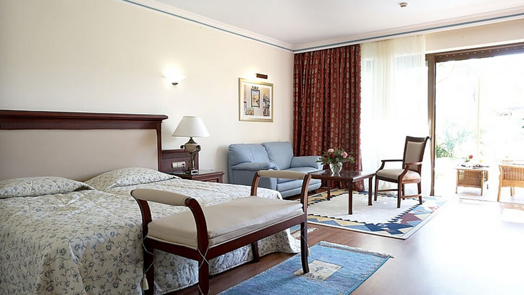 Snídaně formou bohatého bufetu v části oddělené od hotelových hostů. U večeře velký výběr salátů, studených a teplých předkrmů a dezertů formou bufetu. Servírované hlavní jídlo výběrem ze 3 menu. Čtyřikrát týdně tematická večeře s aperitivem zdarma. V den příletu klientiobdrží na pokoj mísu ovoce, láhev vody a vína.
