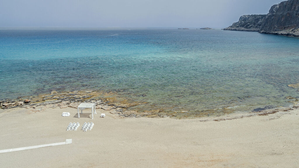 Přímo u privátní písečné pláže (při vstupu oblázky), lehátka a slunečníky zdarma.