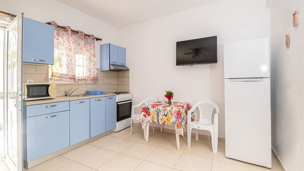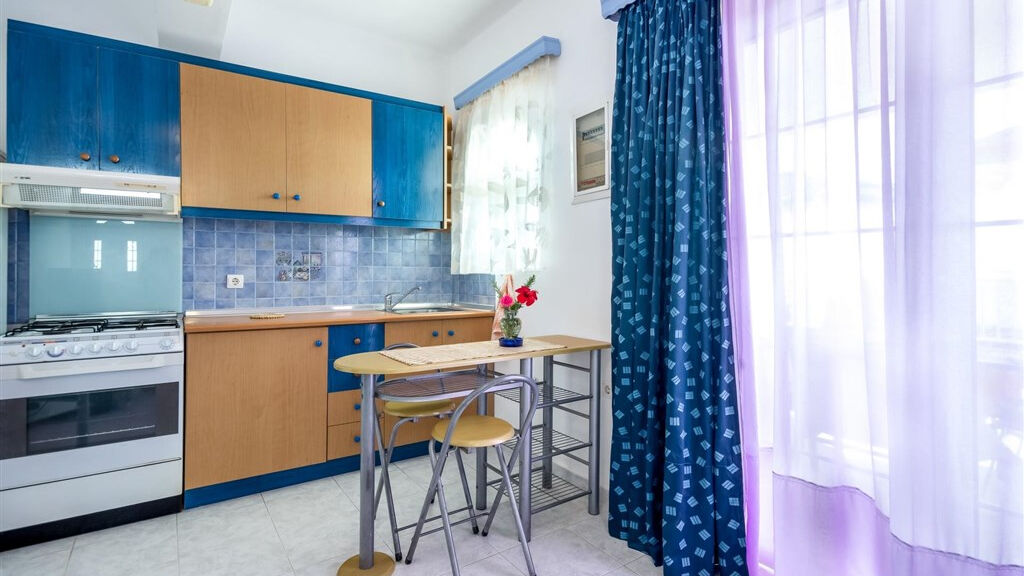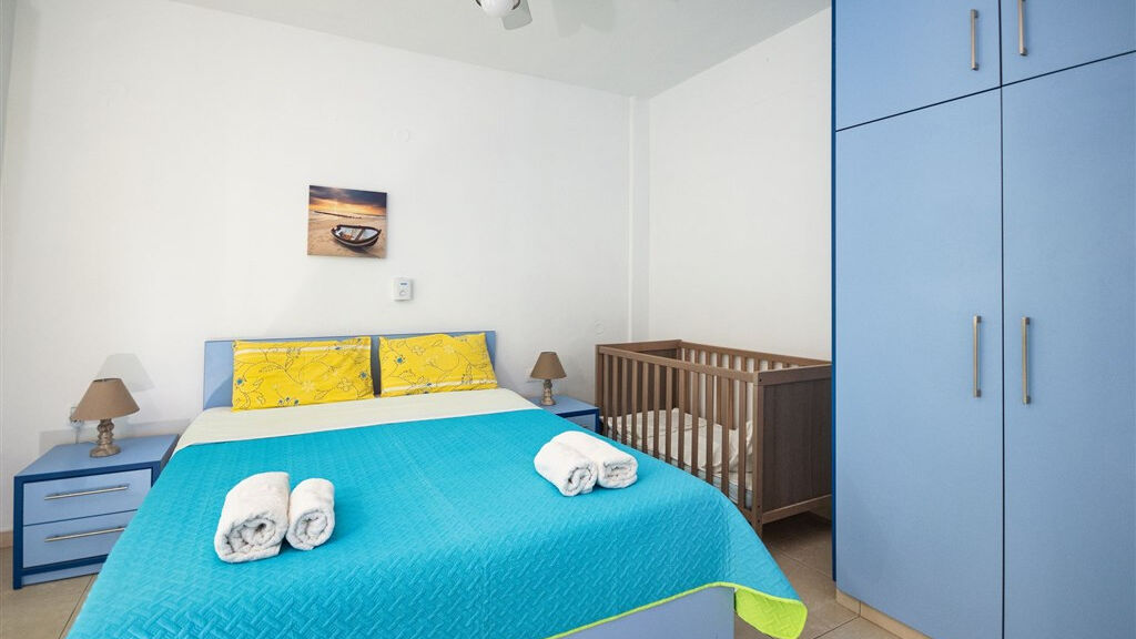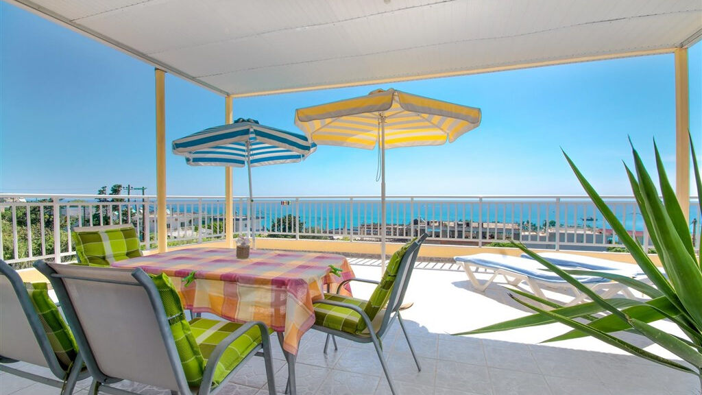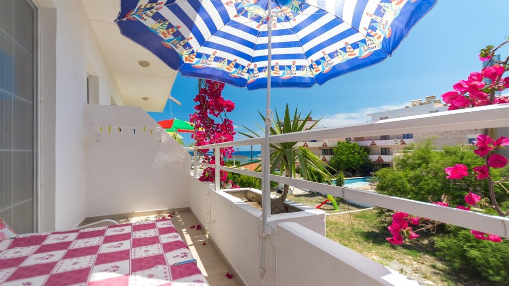 , apartmány až pro 5 osob s výhledem na moře (3 místnosti), koupelna s toaletou, kuchyňský kout (základní nádobí, vařič, lednice), SAT/TV, Wi-Fi, trezor, klimatizace (za poplatek cca 7 €/den), balkon nebo terasa,